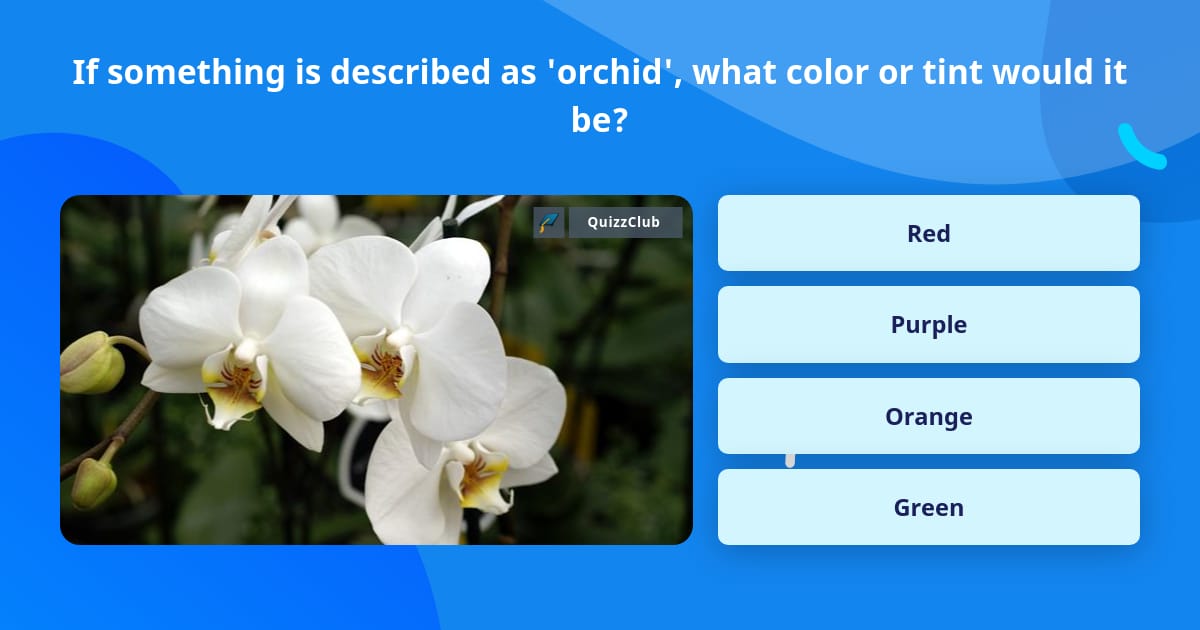 Orchid is a rich purple color and representative of the colors of orchid flowers. Various tones of orchid may range from grayish purple to purplish-pink to strong reddish. Orchids do come in blue but they are very difficult to locate.